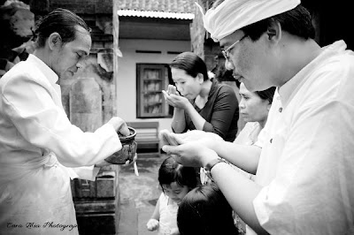 Our wonderful friend and driver Mr. Eka gave me an amazing opportunity to attend a purification ceremony for his daughter Erika in Denpasar. The ritual was partly conducted by this extraordinarily beautiful elder priestess temporarily in a wheelchair because of a knee injury. I don’t know how old she was but it was incredible to see how women hold high ranking positions in their religion until very late in their lives. (Look at the ancient photo above her where she is conducting a ceremony with her late husband) Her son or nephew, I wasn’t sure, presided over the rest of the ceremony and I was completely welcomed to both watch and participate.